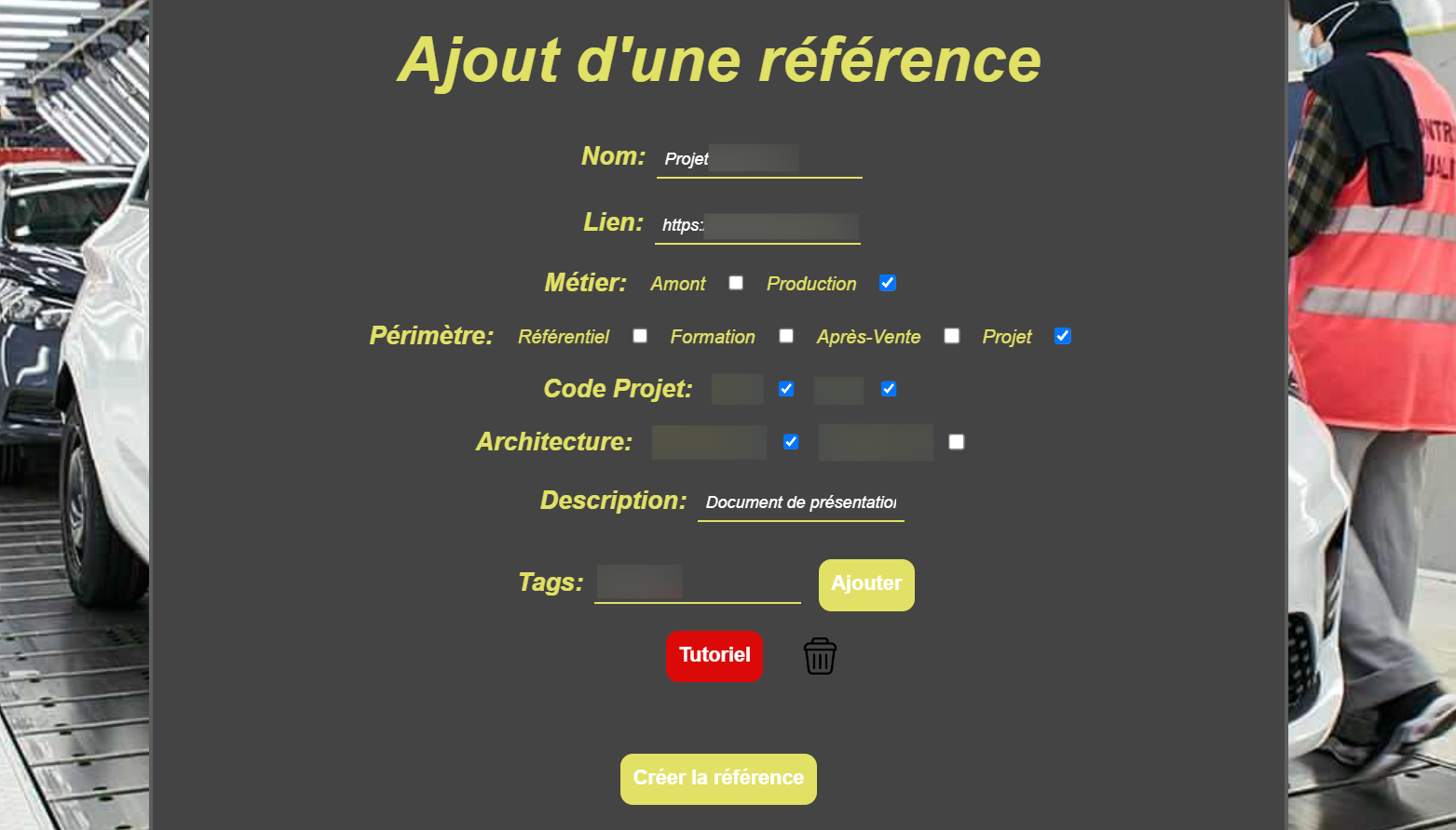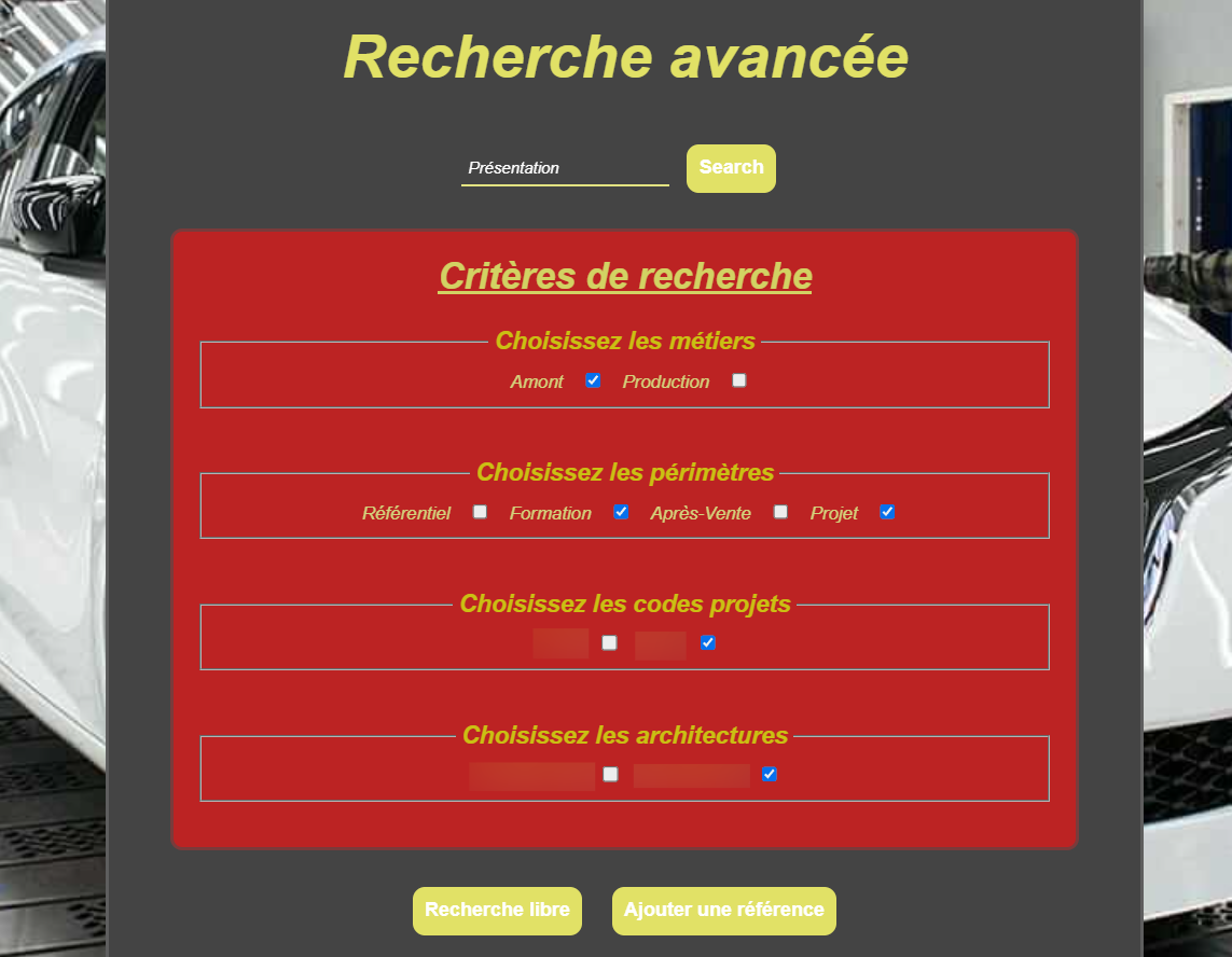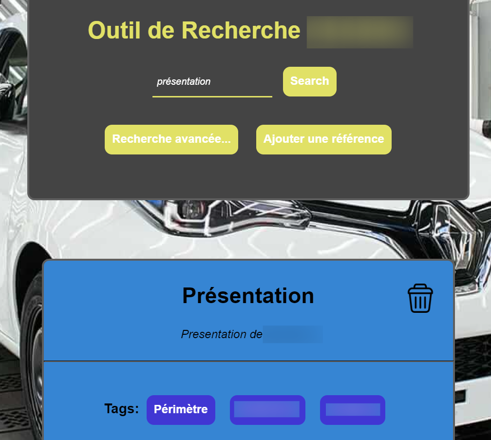 pour un moteur de recherche chez Renault codé en PhP & PostgreSQL qui vise à faciliter la recherche de documents spécifiques à l'équipe dans la base de données de l'entreprise.